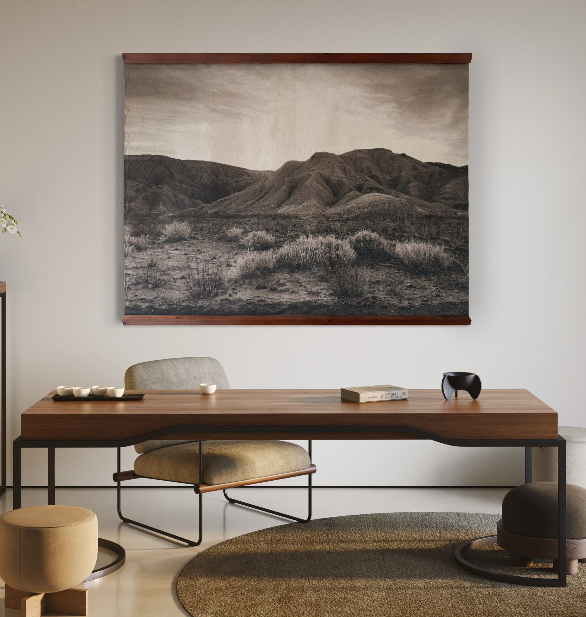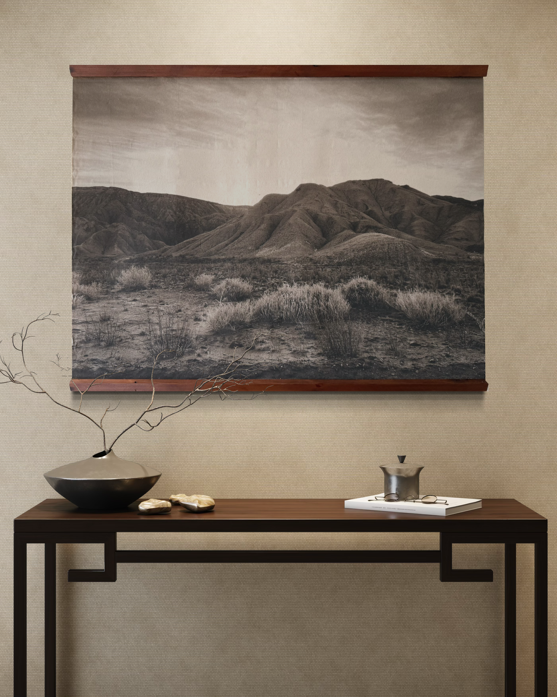 La obra propone una atmósfera de silencio y amplitud —ese tipo de calma que se siente física— y transforma el muro en una ventana hacia un paisaje esencial. Por su paleta sobria y atemporal, se integra con naturalidad en interiores contemporáneos u orgánicos, dialogando especialmente bien con maderas, fibras naturales, piedra y cerámica.