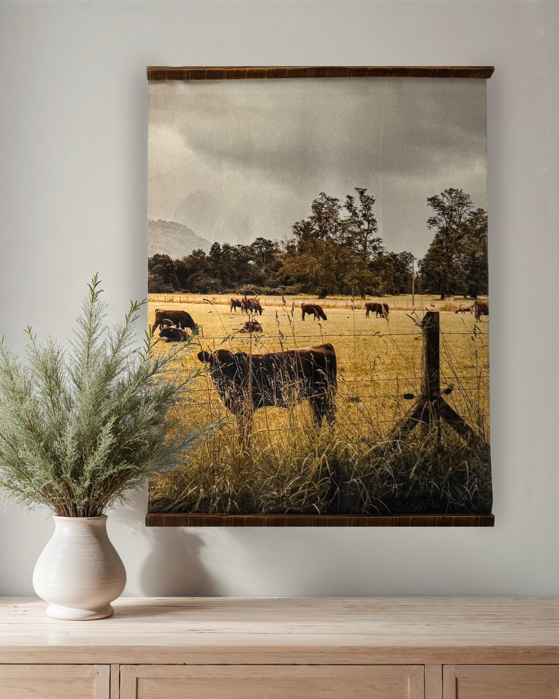Campo Bajo nace de la quietud del paisaje rural, donde el tiempo parece expandirse y la vida transcurre sin prisa. La escena se fragmenta en tres momentos que dialogan entre sí: animales dispersos, pastos bajos y cielos densos que envuelven el campo en una atmósfera silenciosa.