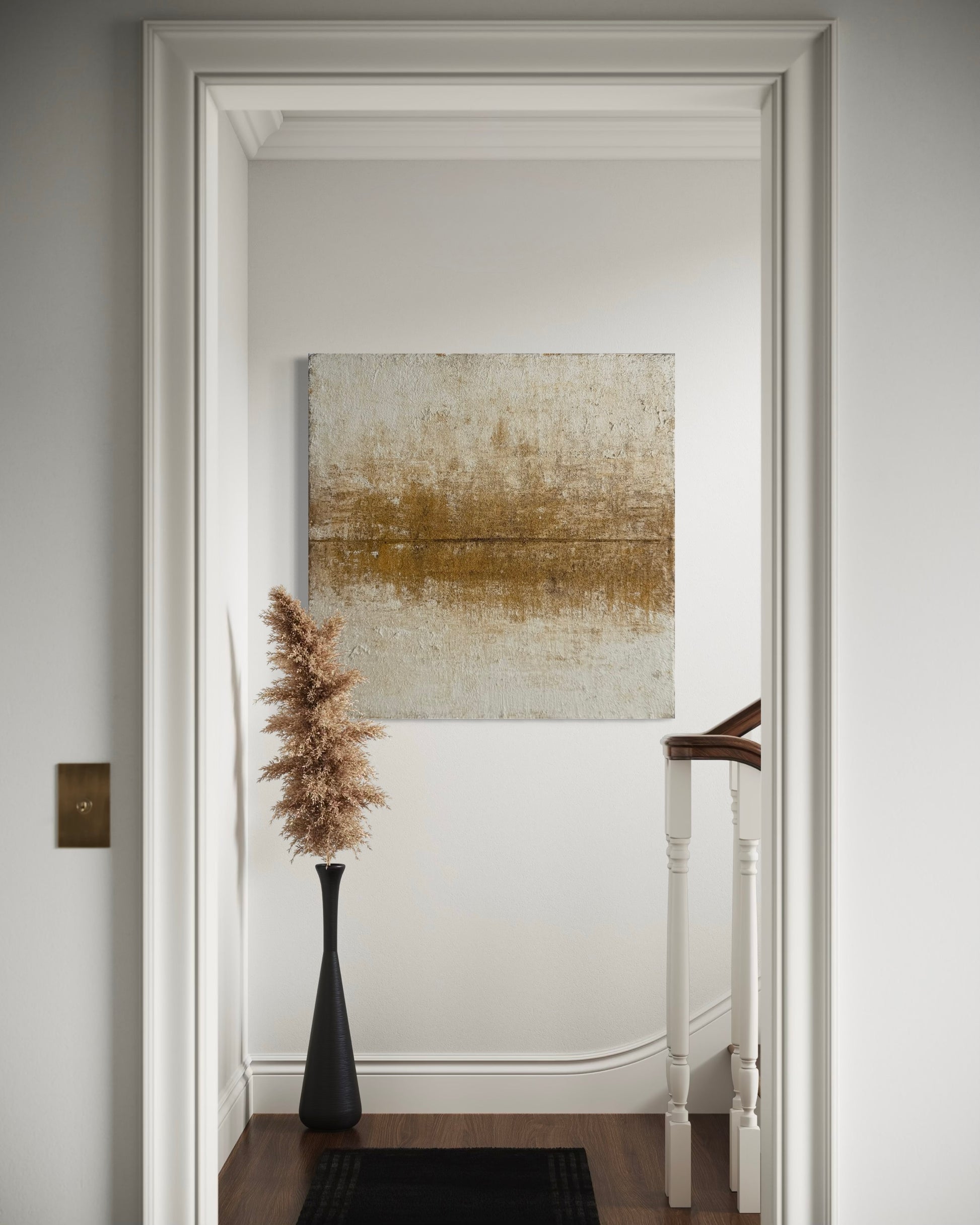 Obra abstracta en tonos neutros, elaborada a partir de telas, pastas, minerales y acrílicos, trabajada con capas y texturas que invitan a la contemplación y al silencio.