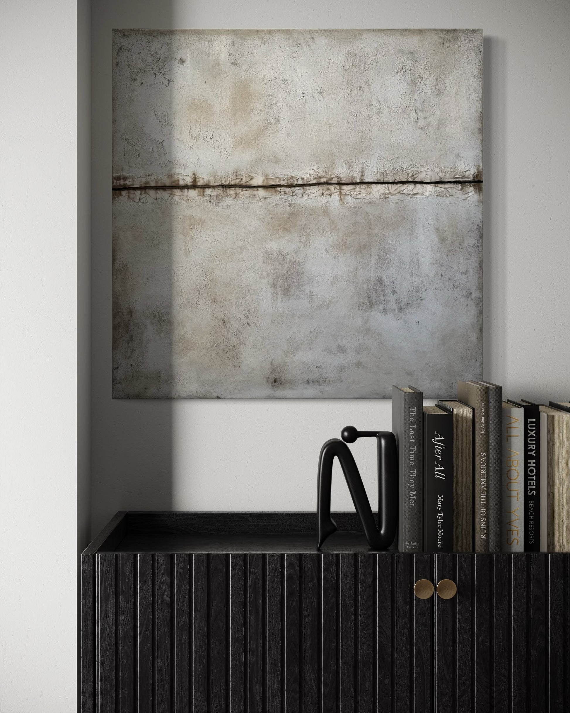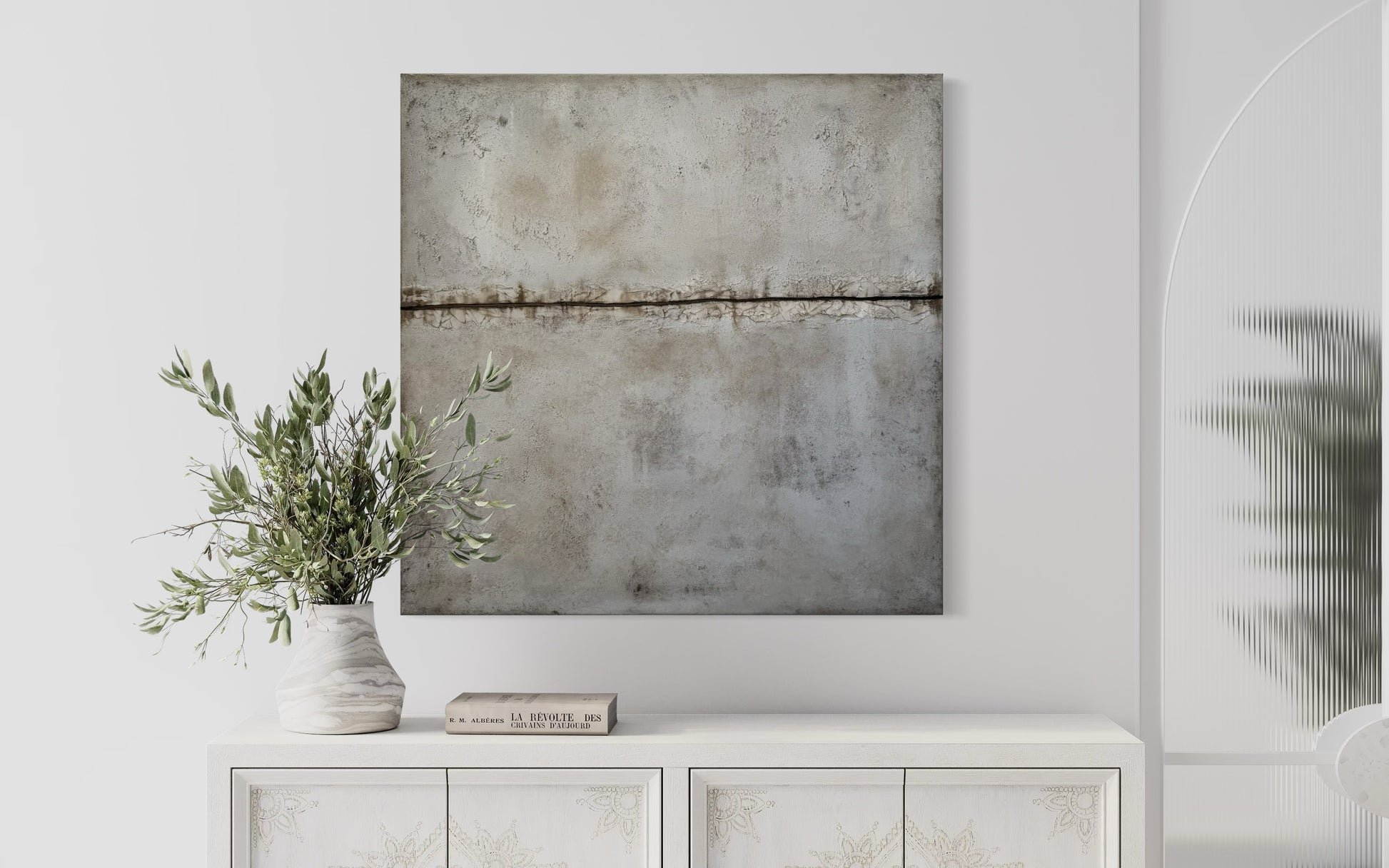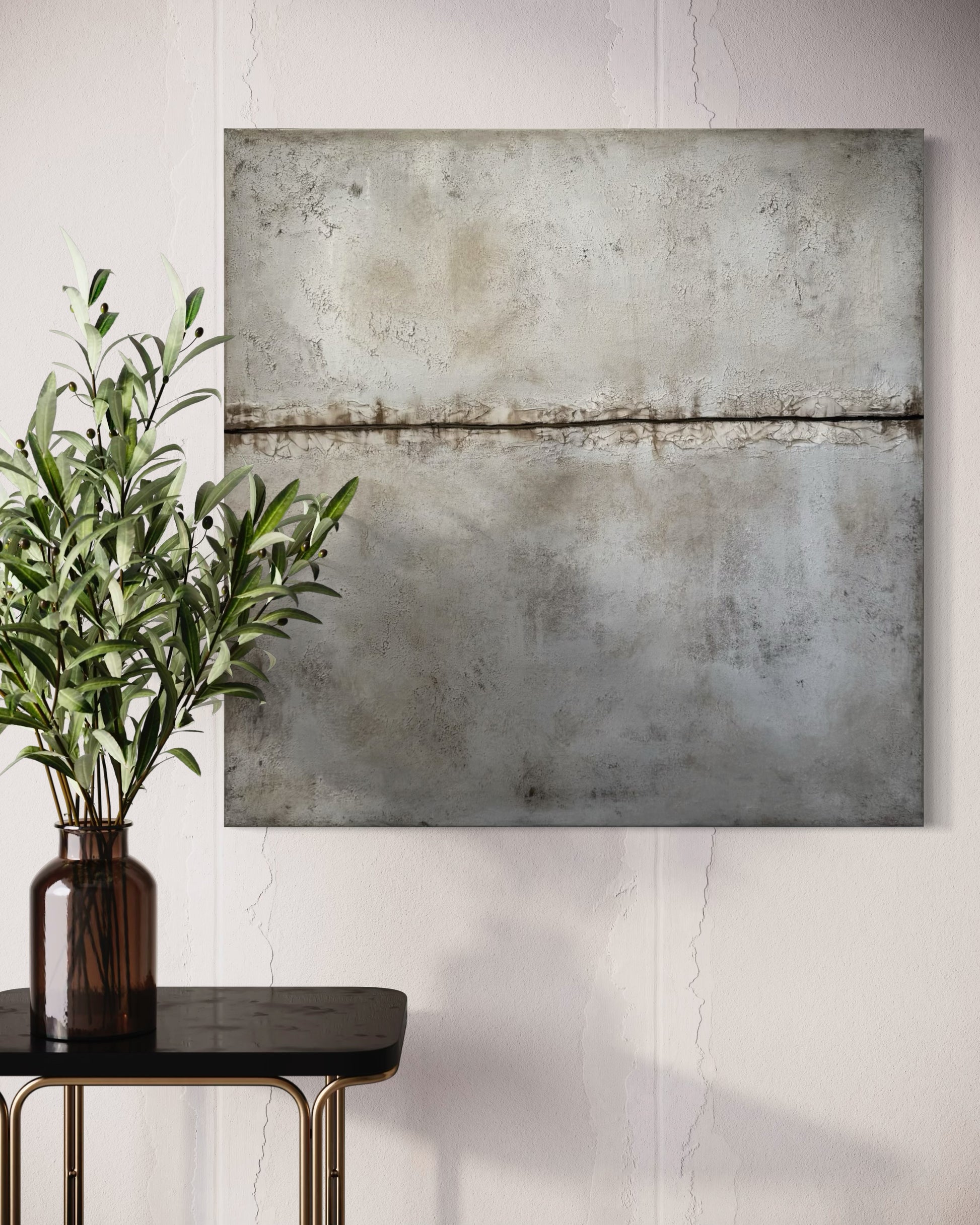 Horizonte sugiere un límite sutil entre tierra y aire, creando una sensación de profundidad y equilibrio. Sus tonos neutros y minerales aportan calma y una presencia silenciosa que se integra de forma natural en interiores contemporáneos, orgánicos o minimalistas. Realizada a mano sobre bastidor, la pieza combina textura, matices y una estética atemporal que acompaña con armonía muebles en madera, fibras naturales y paletas suaves. Una obra que invita a la contemplación desde la sencillez.