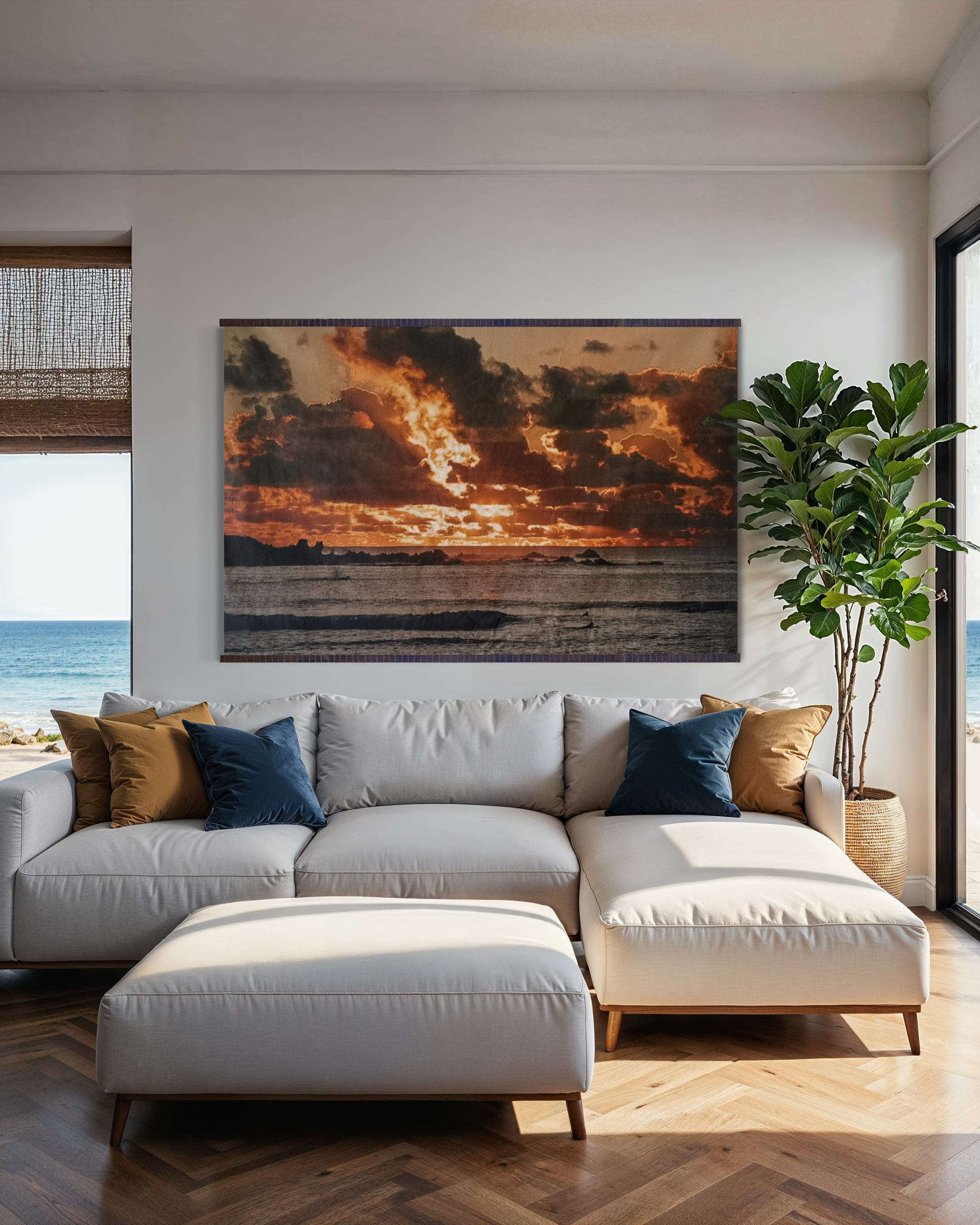 La obra propone un contraste sutil entre energía y calma: el fuego de la luz y la pausa del mar. Su paleta cálida y profunda aporta carácter y atmósfera, funcionando como punto focal en interiores contemporáneos u orgánicos, especialmente junto a maderas, fibras naturales y materiales nobles.
