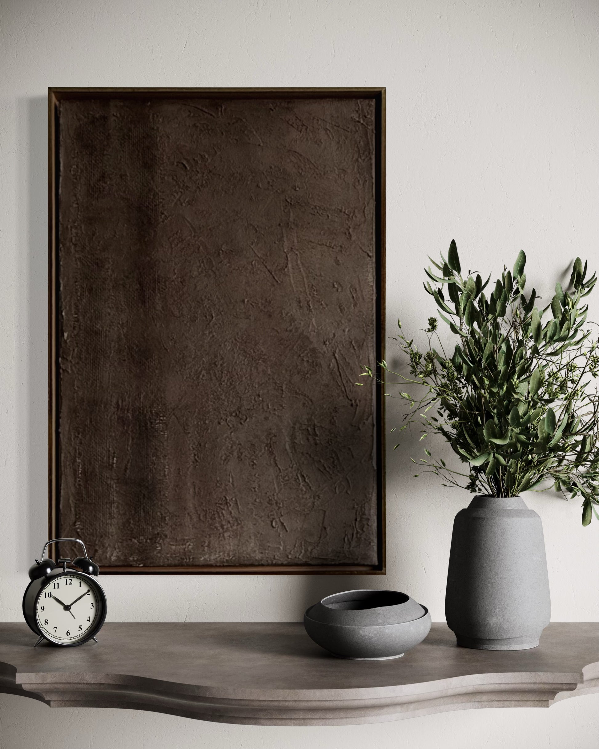 Silencio es una obra que se sostiene en lo mínimo. Una superficie oscura, mineral, donde la luz apenas roza y deja ver capas, grietas suaves y marcas como memoria. Hay una franja vertical más profunda que cae como sombra —un gesto quieto— y todo lo demás respira alrededor.