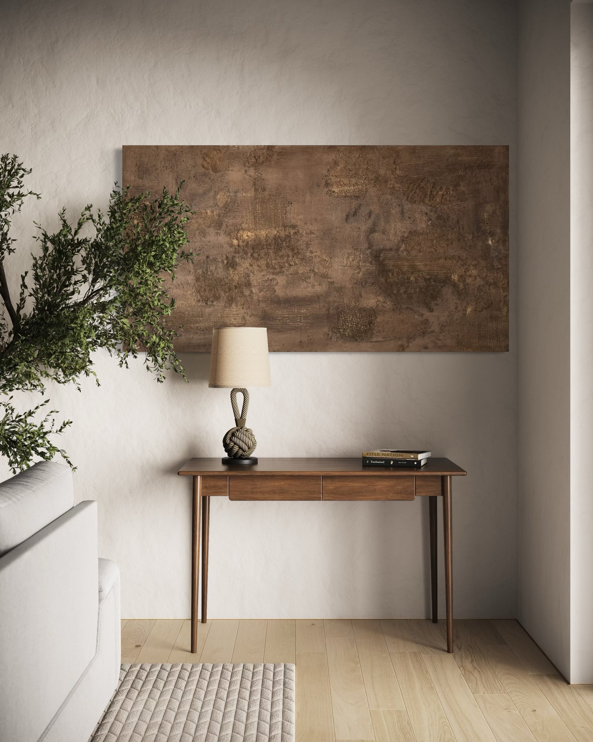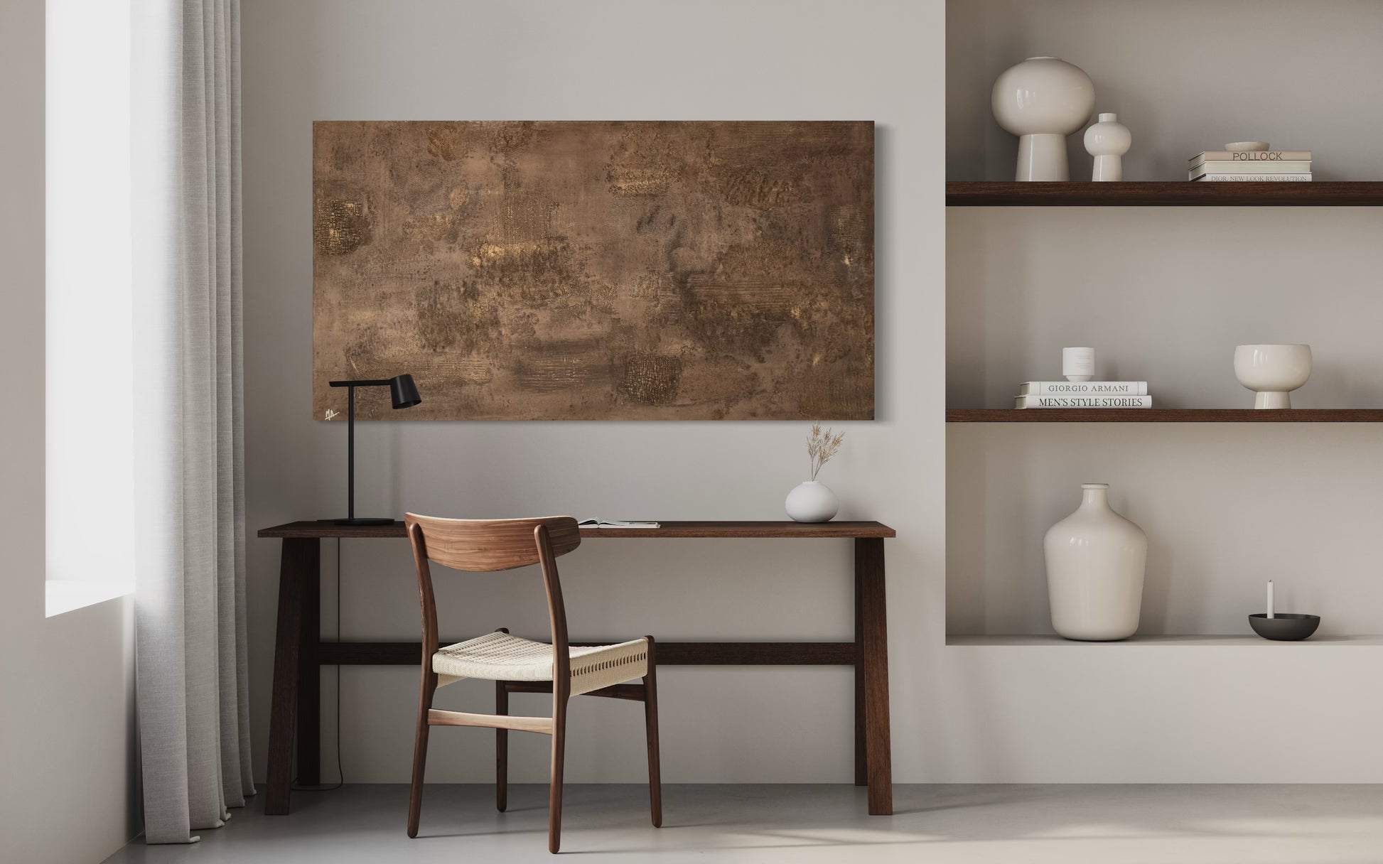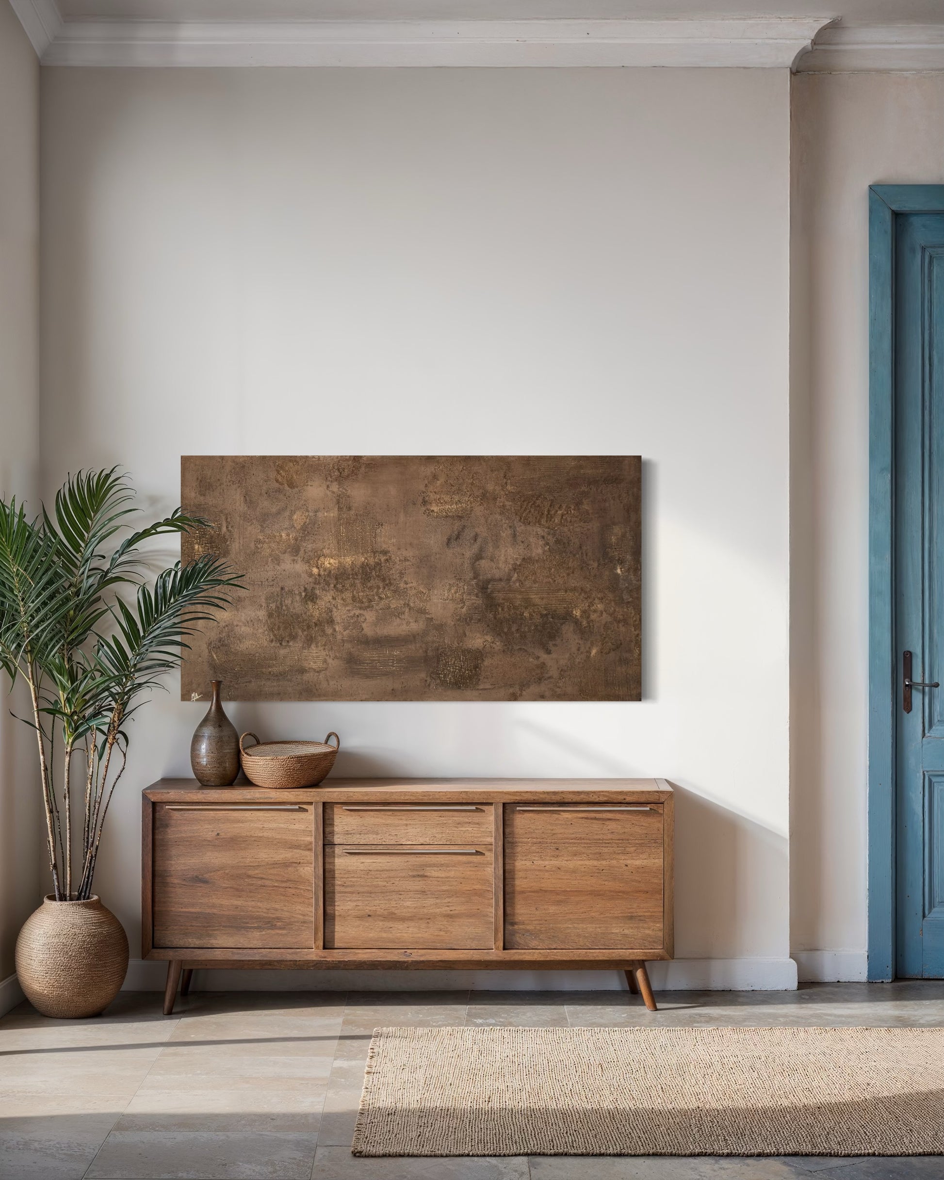 Silente se construye por capas, marcas y tramas: huellas de malla, veladuras y relieves que evocan muros erosionados, sedimentos y superficies antiguas. En su aparente quietud, la pieza guarda ritmo y detalle —pequeños “fragmentos” que emergen y se desvanecen— generando profundidad y una presencia cálida, sobria y contemplativa. Ideal para interiores contemporáneos, orgánicos o minimalistas; dialoga especialmente bien con maderas oscuras, lino, cuero, piedra y paletas neutras, aportando carácter sin saturar el espacio.
