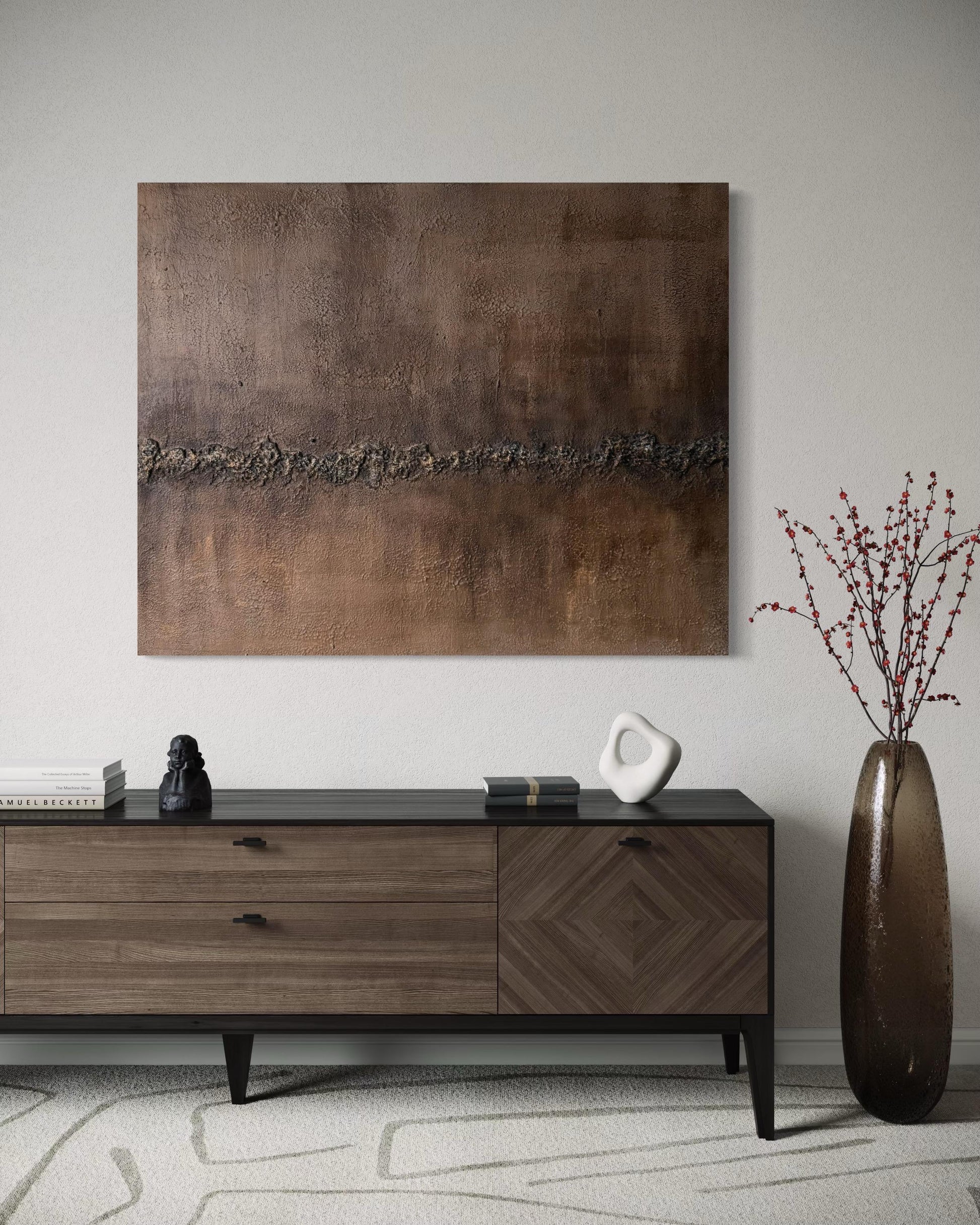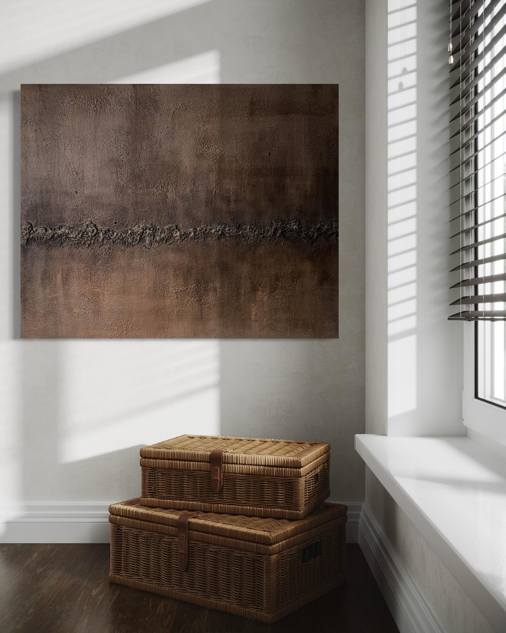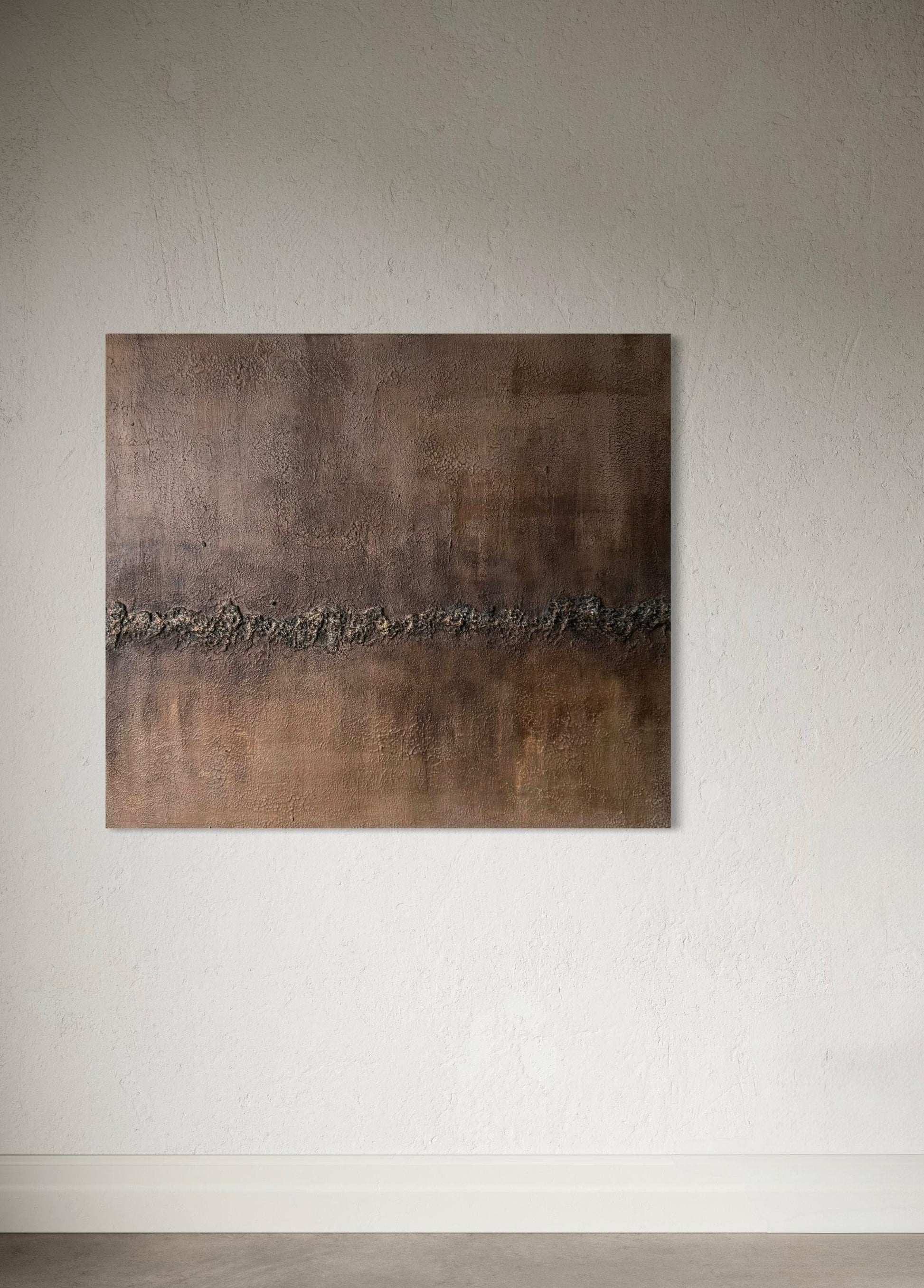 Tierra Baja revela una superficie profunda, cálida y orgánica, construida con veladuras y texturas que evocan estabilidad, enraizamiento y calma.