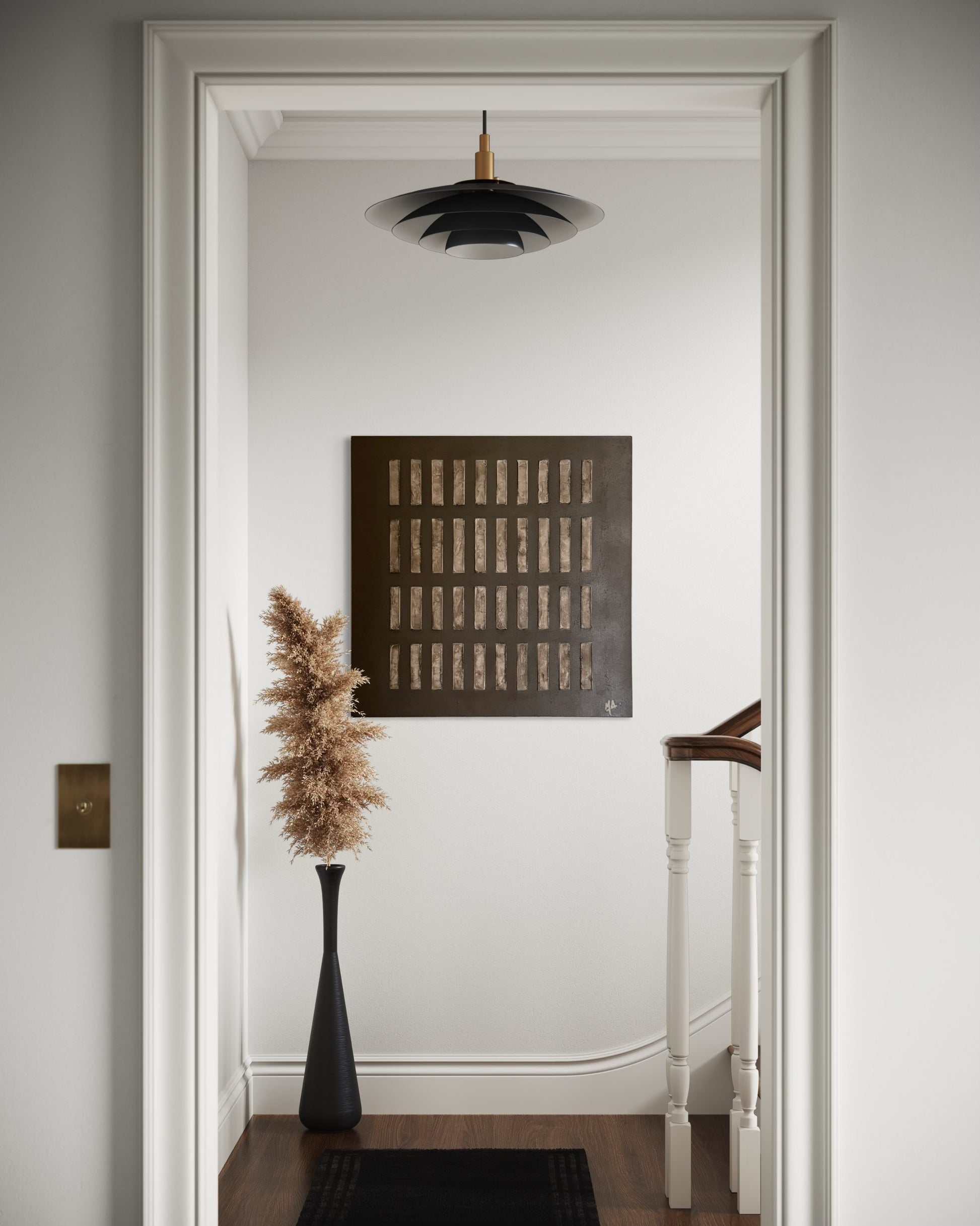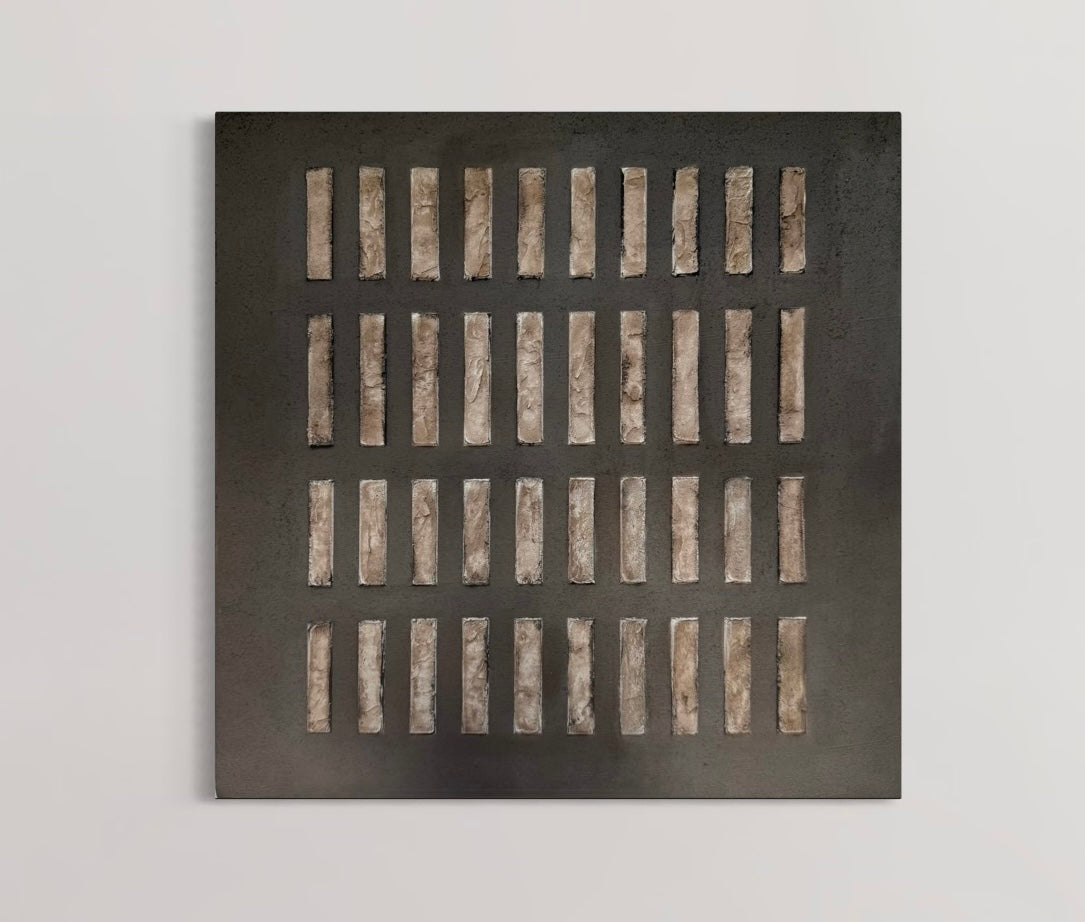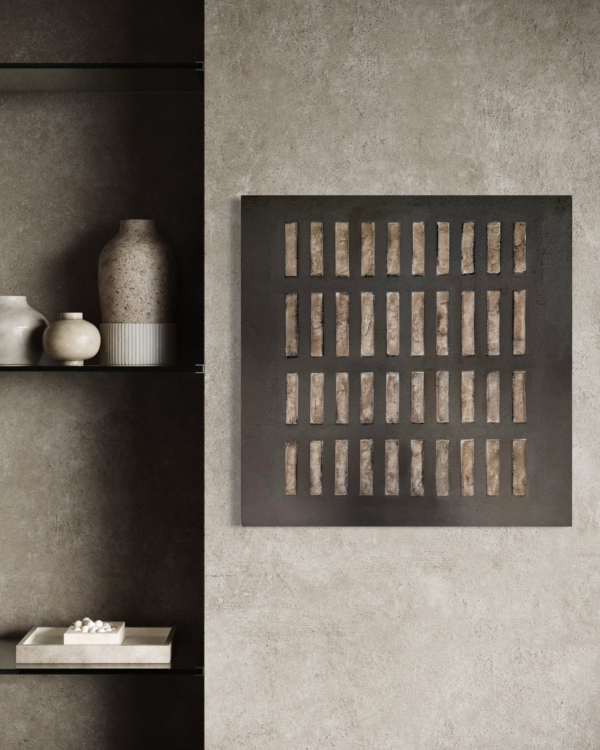 Trama explora la relación entre orden y variación a través de elementos verticales que emergen desde una base oscura, generando profundidad y contraste. Su paleta sobria y mineral aporta carácter y equilibrio, integrándose con naturalidad en espacios contemporáneos y de estética atemporal.