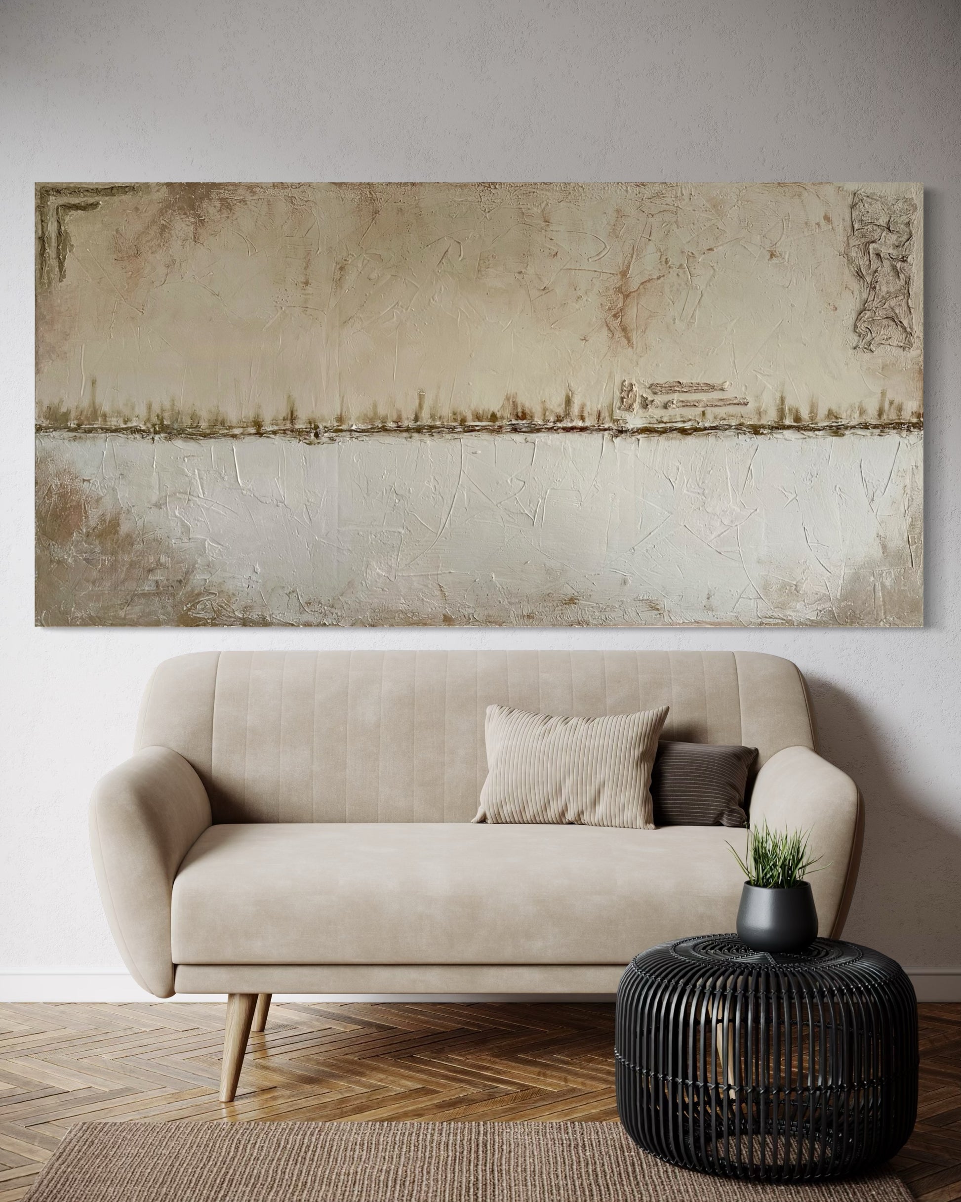 Obra abstracta en tonos neutros, elaborada a partir de telas, pastas, minerales y acrílicos, trabajada con capas y texturas que invitan a la contemplación y al silencio.