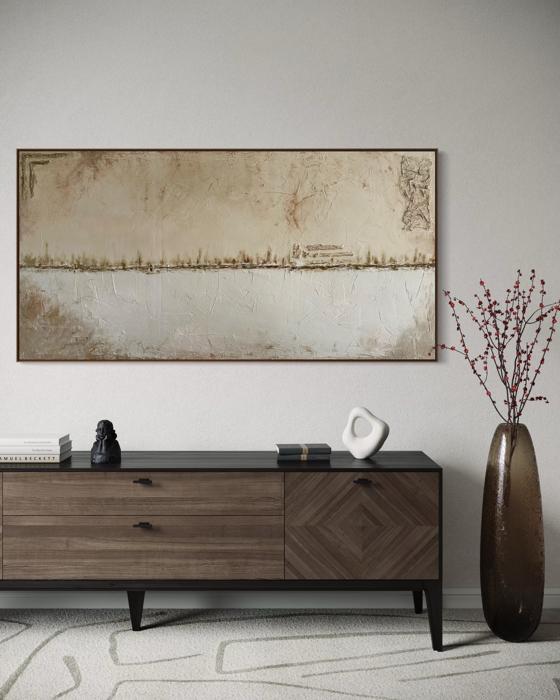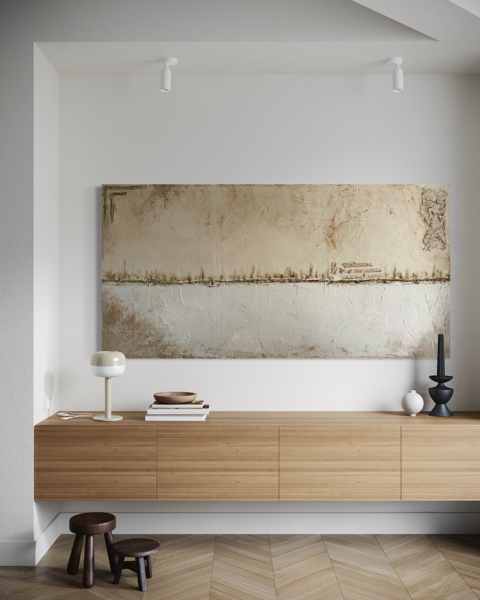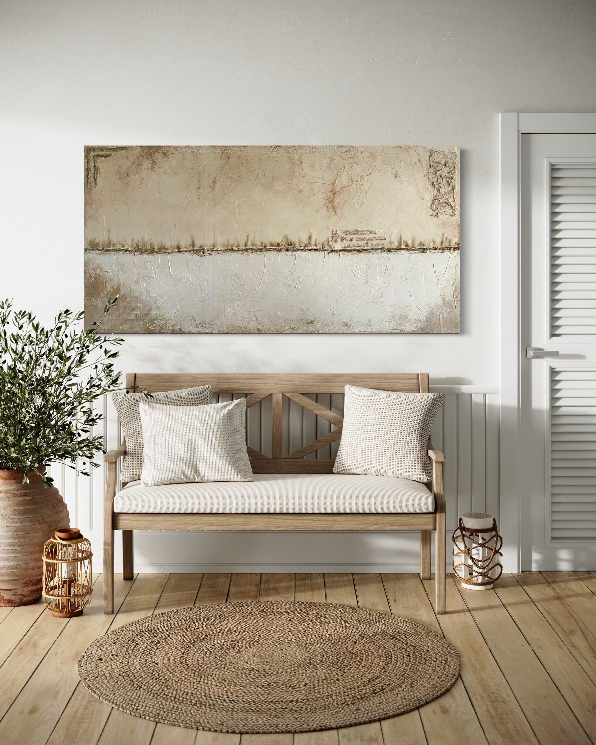 Vera es una obra de luz quieta. Un paisaje mínimo en tonos marfil y arena, donde la materia se abre en veladuras suaves y marcas finas, como si el tiempo hubiese pasado rozando la superficie.